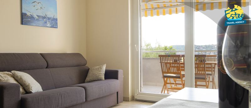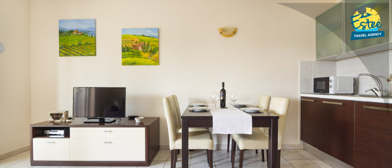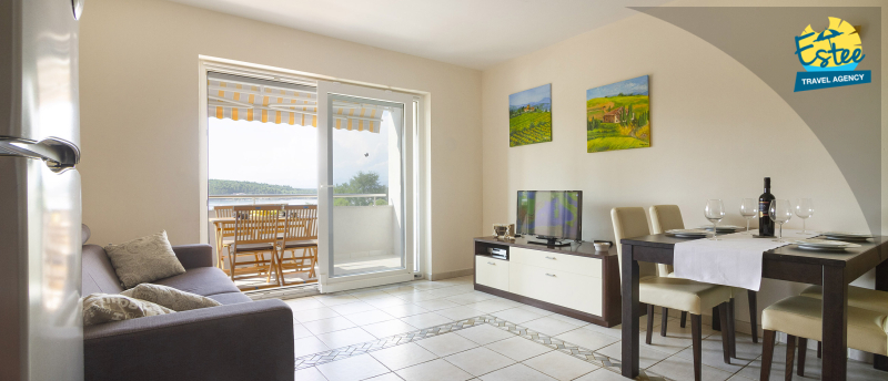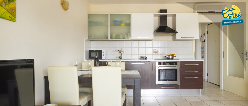 Sofa bed for two persons, Dining room, living room and kitchen - one unit, Tiles, SAT TV, Balcony with a sea view