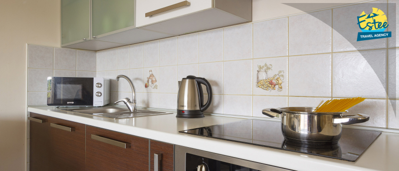 Coffee machine, Refrigerator with a freezer compartment, Kitchen towels provided, kitchen accessories, pots, cutlery, etc. provided, Tiles, Table and chairs for all persons