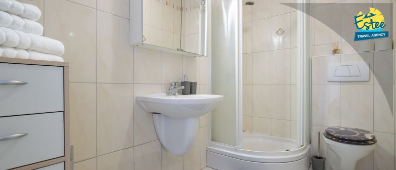 Bathroom with shower and WC, Towels (1 large, 1 small/per person and week), Tiles