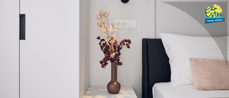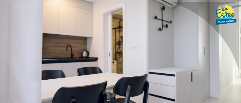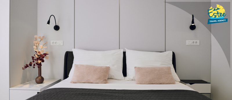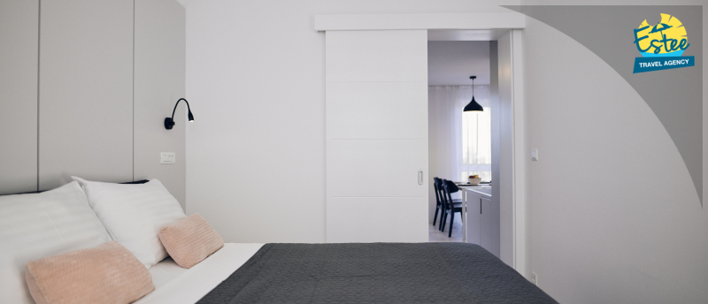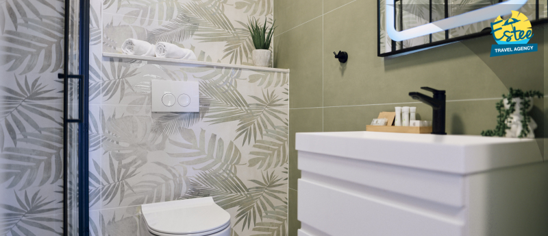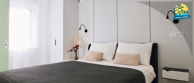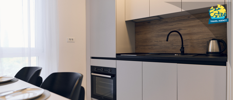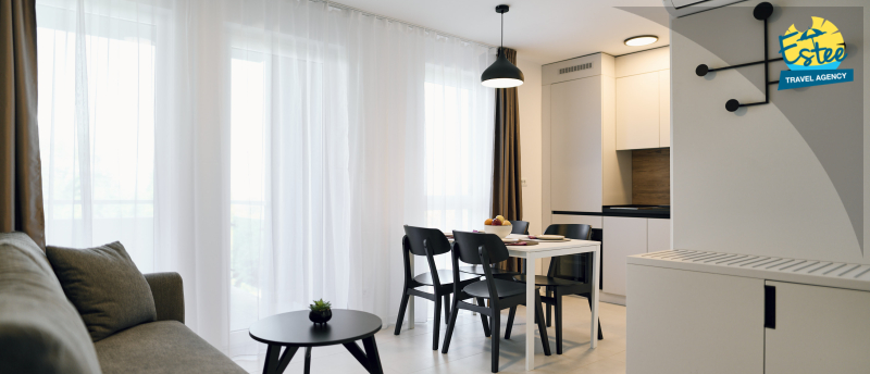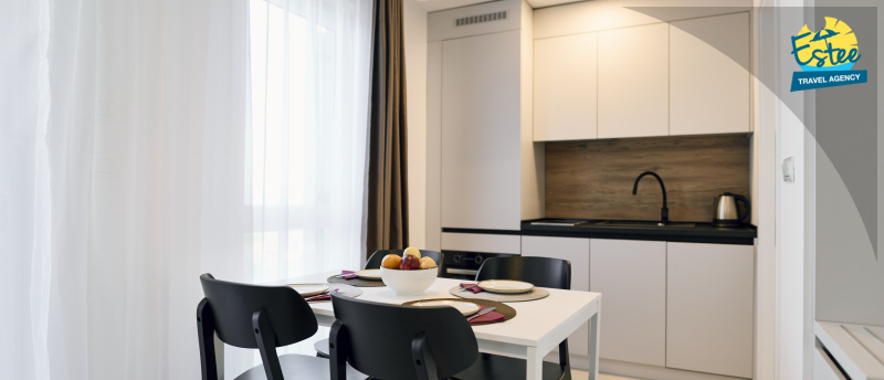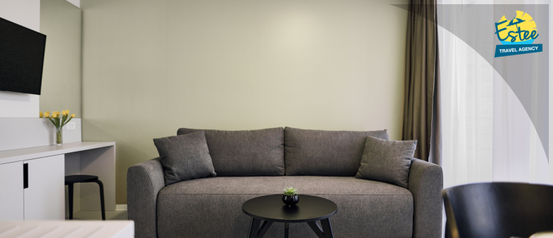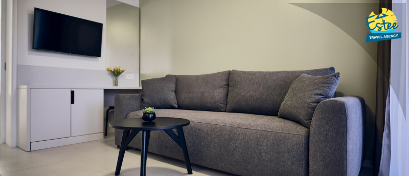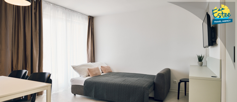 A modern studio apartment with a balcony, 32 m2, is located on the first floor of the building and is accessible only by stairs. Each apartment is air-conditioned, has a flat-screen TV with satellite programs, safe, telephone and high-speed WI-FI internet.