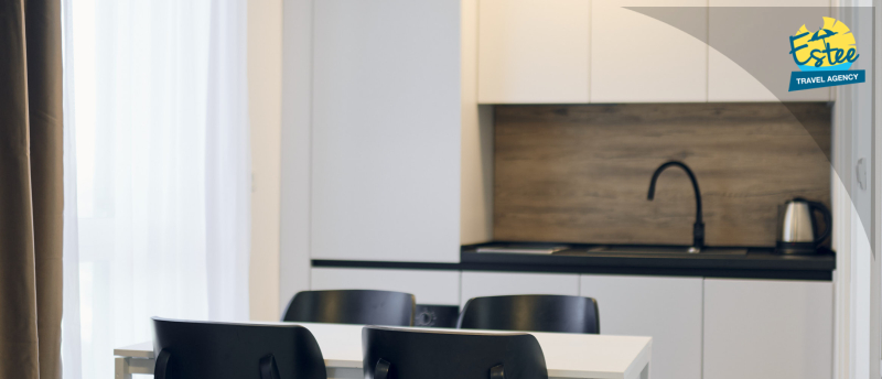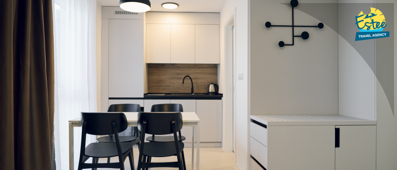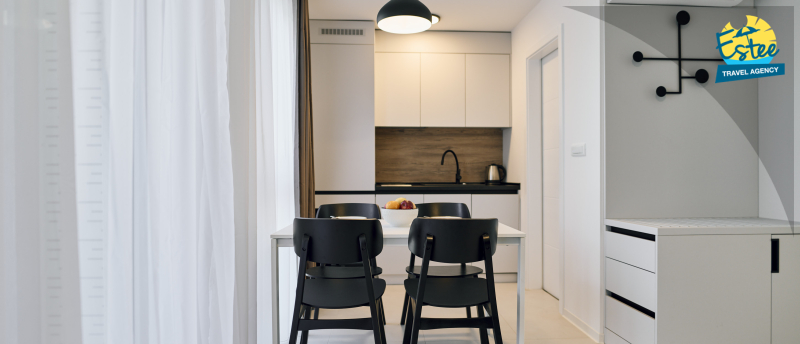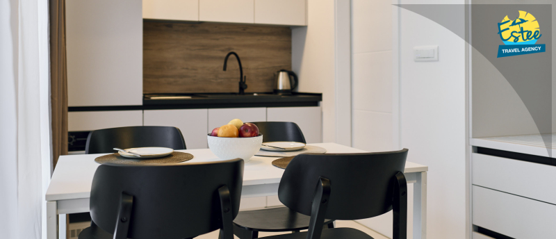 The elegant and functional kitchen contains a refrigerator with freezer, a dishwasher, an oven, an electric hob, a kettle and basic cooking equipment and a dining area suitable for 4 people.
