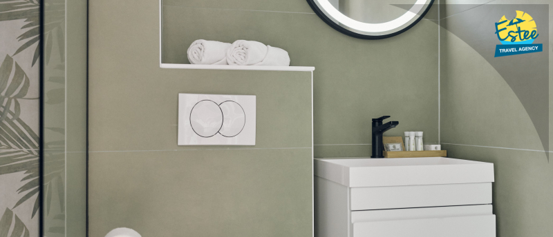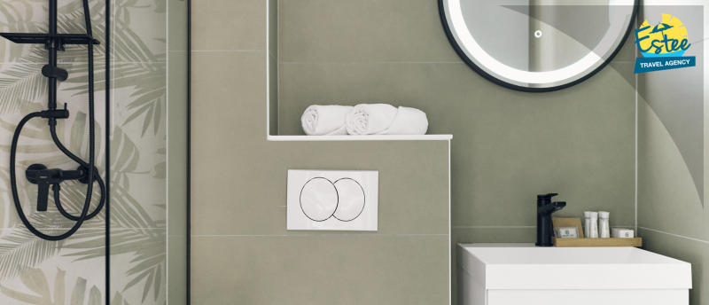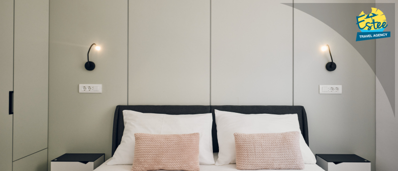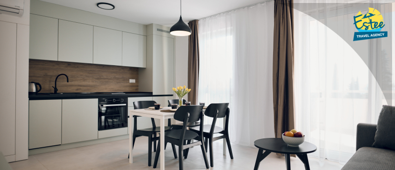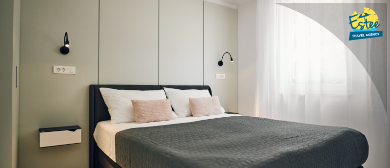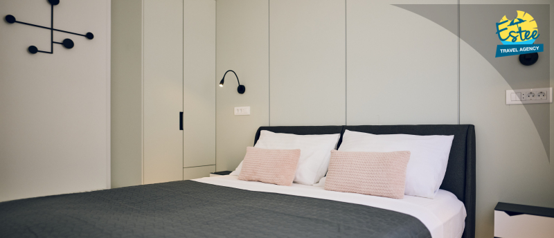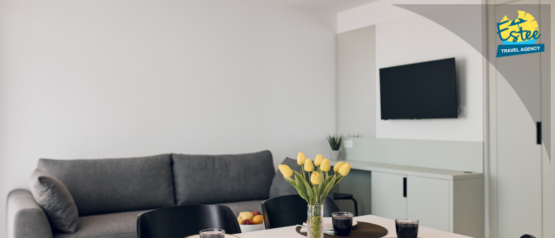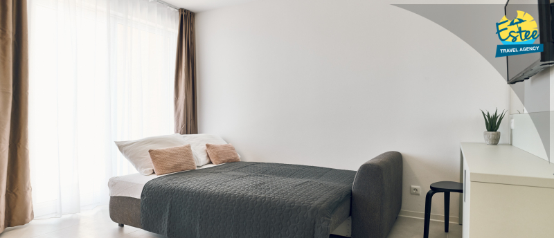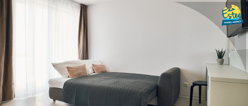 Modern one-bedroom apartment with balcony, 38 m2, is located on the 1st floor of the building and is accessible only by stairs. Each apartment is air-conditioned, has a flat-screen TV with satellite programs, safe, telephone and high-speed WI-FI internet.