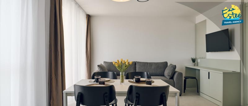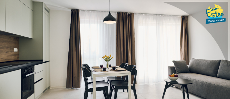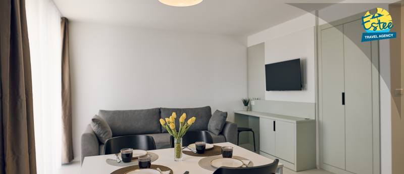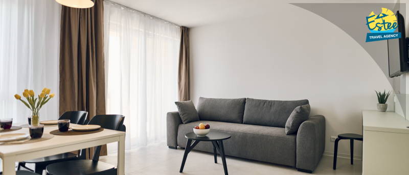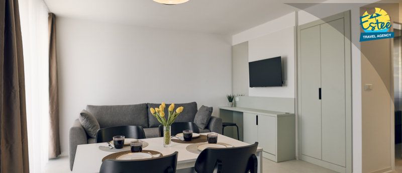 The bedroom with a double bed (160x200 cm) is separated from the living area. The living room can accommodate additional 2 people on the sofa (160x200cm) and has access to a furnished balcony with a view of the nearby pine forest.