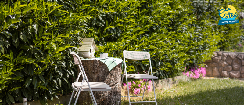 It`s located on a large closed yard with bushes and trees surrounded by a fence.