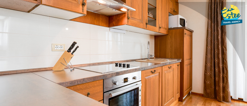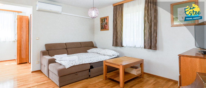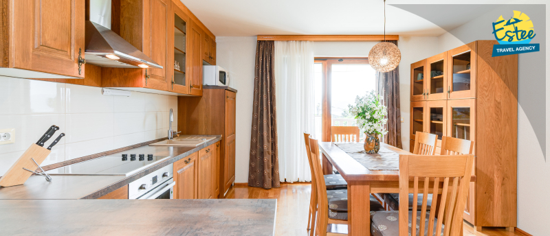 Electric kettle, Dishwasher, Coffee machine, Kitchen towels provided, Kitchen accessories, pots, cutlery, etc. provided, Table and chairs for all persons, Own terrace, SAT TV, Dining room, living room and kitchen - one unit, Oven, Refrigerator/freezer combination, Sofa bed for two persons, Microwave, Toster